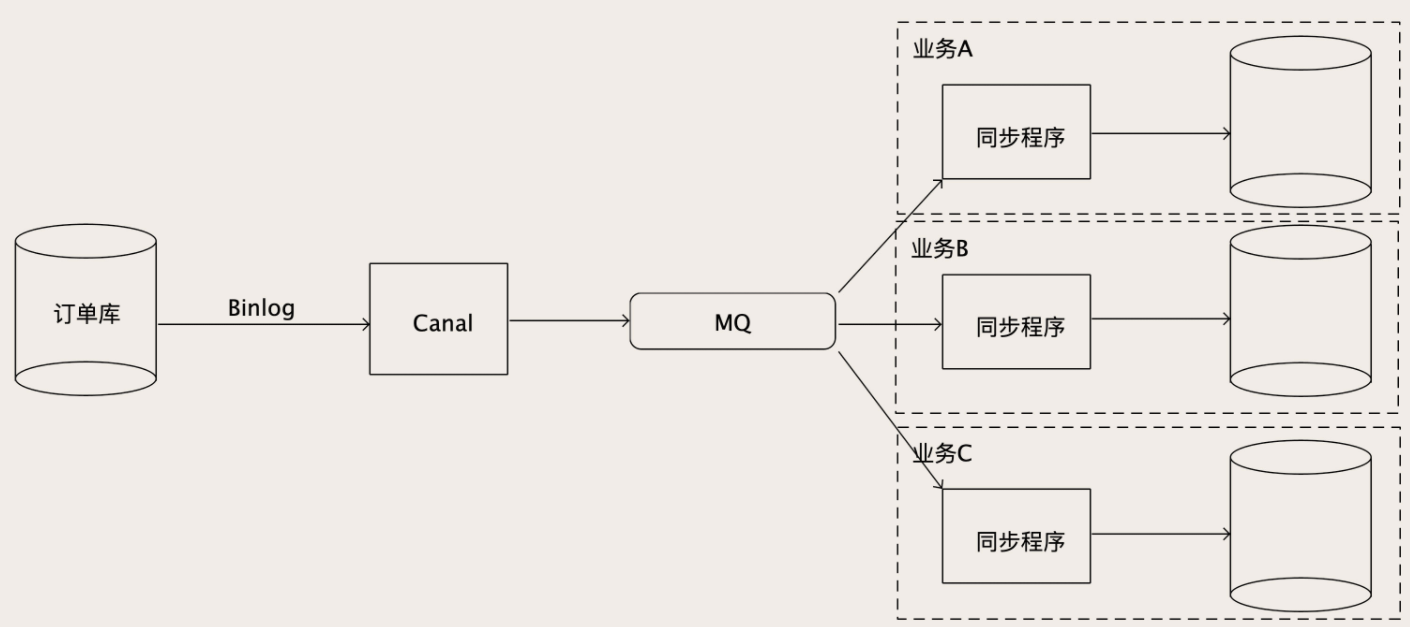 Canal 从 MySQL 收到 Binlog 并解析成结构化数据之后,直接写入到 MQ 的一个订单 Binlog 主题中,然后每一个需要同步订单数据的业务方,都去订阅这个 MQ 中的订单 Binlog 主题,消费解析后的 Binlog 数据。在每个消费者自己的同步程序中,它既可以直接入库,也可以做一些数据转换、过滤或者计算之后再入库,这样就比较灵活了。
