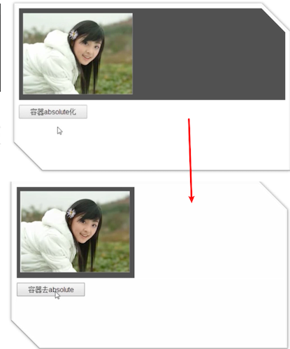 原本三张图片是并排在一起的,使用 absolute 后,第二张图片飞翔了,但是它还是在原来的位置,只是飞起来了