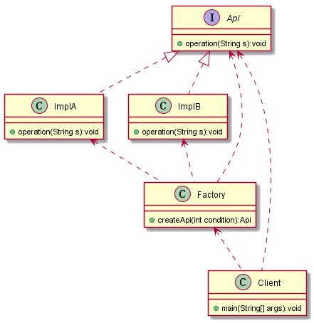 首先来解决一个常见的疑问: 可能有朋友会认为,上面的示列中的简单工厂看起来不就是把客户端里面的 new Impl() 移动到简单工厂里面吗?不还是一样通过 new 实现类来得到接口吗? 把 new Impl() 这句话放到客户端和放到简单工厂里面有什么不同吗?