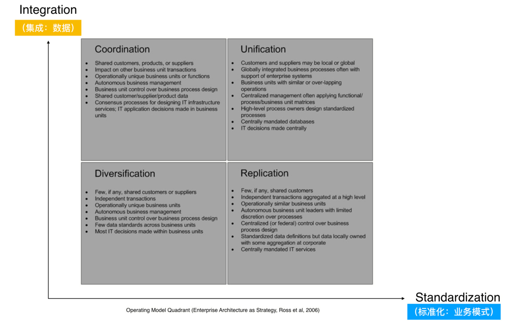 这是哈佛大学出版社 2006 年出版的一本讲企业架构战略的书里提到的一个商业运营模型(Business Operating Model),它提出两个象限: