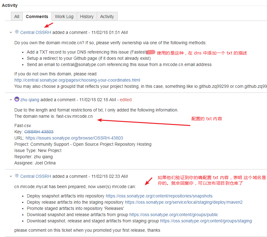 创建完成之后就会出一个 issues, 比如这个: https://issues.sonatype.org/browse/OSSRH-43803