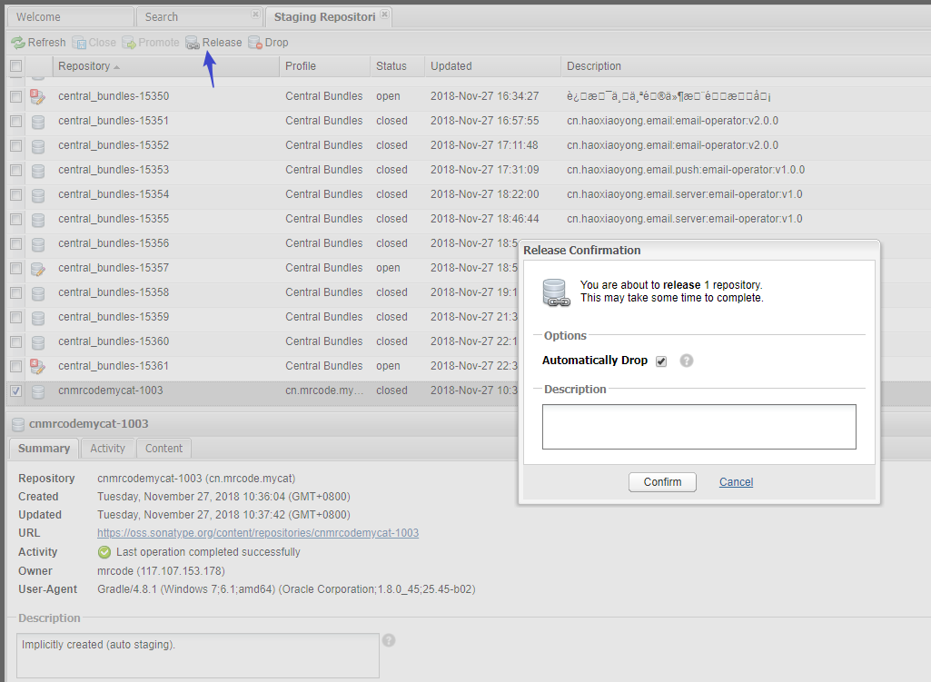 再去之前 issues 项目页面 https://issues.sonatype.org/browse/OSSRH-43803 回复下;