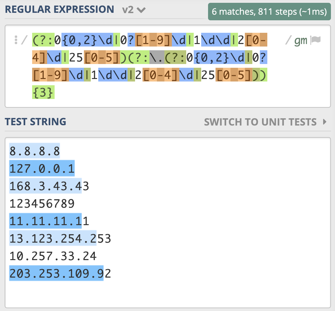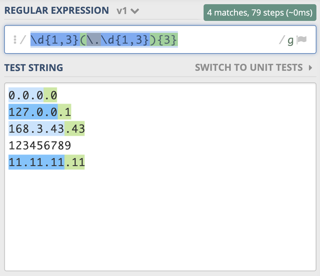 在这里我还是想说一下,如果只是验证是不是合法的 IPv4 地址,可以直接使用点号切割,验证一下是不是四个部分,每个部分是不是在 0-255 之间就可以了,比使用正则来校验要简单很多,而且不容易出错。总之正则不是解决问题的唯一方法,我们要在合适的时候使用它,而不是说能用正则的都要用正则来解决。